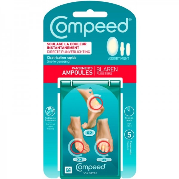 Compeed Blister On Toes Plasters are second-skin healing plasters for blisters that instantly relieve the pain and help to accelerate the process. The hydrocolloid technology is able to absorb moisture from the blister, keeping the surrounding environment perfect for maximum healing. These plasters stay in place for several days, preventing rubbing and protecting the healing skin.