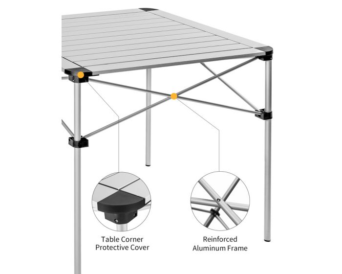 Description Perfect size and use:27.6"x27.6"x27.2", designed for 4 people, perfect for outdoor picnic cookouts even family activities. Telescoping leg design allows the one-piece, full-sized table to collapse easily and fold compactly Easy to set up: Split design of the board and bracket, quick to set up, roll-top design packs up small, yet provides plenty of space for cutlery. The foldable camp table packs up into the included carry bag for easy storage and transport. Stable design: The aluminum alloy desktop is made of aluminum alloy and anode oxidation treatment, no rust, corrosion resistance and easy to clean up. Metal material contact point and triangular steel structure design makes table stable. Lightweight and portable:The foldable table only 7.5lbs, folded size:29x9x5inches,space-saving,fits most car trunks. Aluminum construction saves on weight so that the table is portable and light enough to be carried around your trip. Multi-use: KingCamp folding outdoor table is perfect to be used indoors, or bring it to outdoor activities for a picnic, camping, patio party. Best Use:Camping Color:Silver Unfolded Dimensions:27.6"x27.6"x27.2" Packed Size:29"x9"x5" Frame Construction:Aluminum Tabletop Material:Aluminium Alloy Carry Bag Material:210D Oxford Weight Capacity:176lbs(80kg) Weight:7.6lbs(3.4kg)