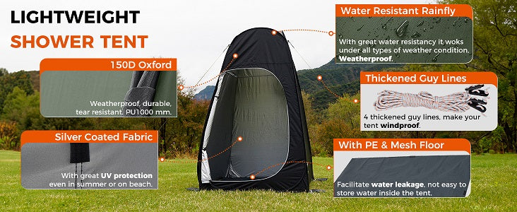 ?WATERPROOF & WINDPROOF & SUN PROTECTION?It is crafted from 150D silver-coated, waterproof oxford and a high-strength flexible steel frame for durability. It reflects sunlight, blocking up to 98% harmful UV rays, safeguarding you from sunburn. Quick-drying waterproof material ensures the privacy shelter stays dry.