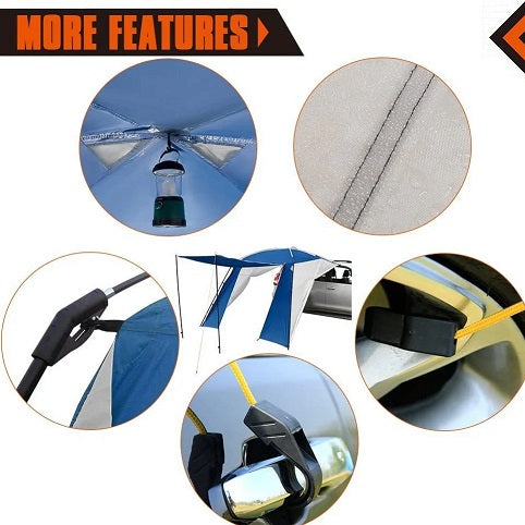 A spacious three-wall awning for motorists. The rear wall opens and attaches to the car. Can be installed independently as a blind.