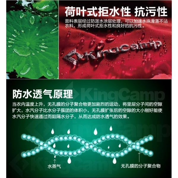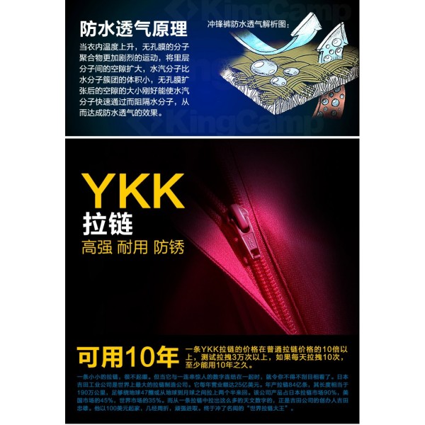 When skiing, especially when sliding from a higher terrain to a lower area, the speed of taxiing is fast. In this process, the human body consumes a lot of physical strength and at the same time discharges sweat, so the windproof and breathable nature of the ski pants is very important. KingCamp ski pants KW7090, KW7091 adopt Climate release waterproof and breathable fabric, waterproof 5000mm, breathable 5000g/m2/24h, the surface is treated with Teflon, all the seam parts are protected by waterproof stickers, providing perfect anti-splash and anti-oil effect.