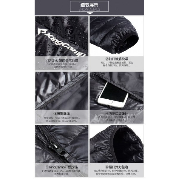KingCamp Outdoor Men's Light Coat Hooded 90% White Duck Down Jackets Soft Shell Fleece Winter Jacket Hooded Packable Outerwear Brand Name: kingcamp Feature: Thermal,Windproof,Waterproof Cuff Style: Rib sleeve Weight: 600g Down Content: 90% Fit: Fits smaller than usual. Please check this store's sizing info Gender: Men Closure Type: Zipper Material: Nylon Filling: White duck down.