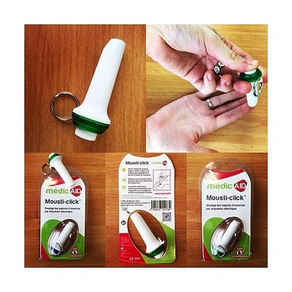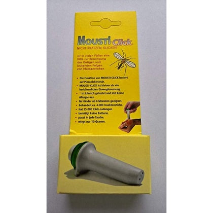 MOUSTI-CLICK is a revolutionary and effective way to eliminate the annoying and itchy effects of insect bites. MOUSTI-CLICK helps against stings of mosquitoes, horseflies (brakes) wasps, bees and jellyfish burns. The function of MOUSTI-CLICK is based on piezoelectricity. Therefore, MOUSTI-CLICK works without battery. MOUSTI-CLICK is smaller than a conventional disposable lighter. is clinically tested and does not trigger any allergy. suitable for children from 6 months. treated about 4,000 insect bites. has 20,000 click charges. does not need a battery. fits in any pocket. weighs only 10grams. Instructions for use: hold MOUSTI-CLICK on an insect repellent and click on 8-15 times in sequence. Itching and Inflammation is electrothermically neutralized and no longer bother. After a few minutes the itching laps. If necessary repeat the treatment after 10 minutes. MOUSTI-CLICK does not harm your health and guarantees you more than 4000 treatments. Attention! For external use. Do not treat your eyes, mouth or other sensitive parts with MOUSTI-CLICK. MOUSTI-CLICK can ignite inflammatory substances. Not suitable for epilepsy patients or carriers of cardiac pacemakers. A medical device of Class IIa, CE 0051 EAN