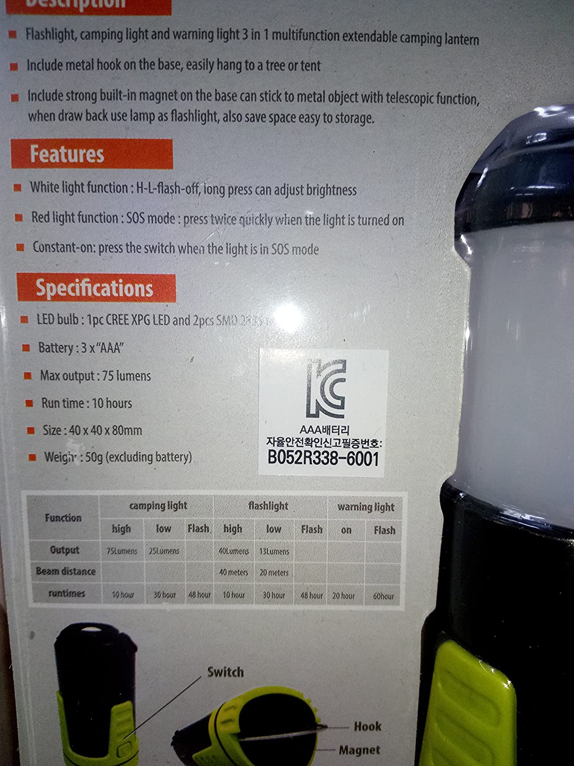 Flash Light ,Camping light and warning light 3in1 multifunction extendable camping lantern Include metal hook on the base,easily hang to a tree or tent include strong built in magnet on the base can stick to metal object with telescopic function,when draw back use lamp as flash light also save space easy to storageWhite light function:H-L flash off, Long press can adjust brightnessRed light function :SOS mode: press twice quickly when the light is turned on [N-Rit] Owl Eyes [Large] 3-in-1 Multifunctional Extendable [115 Lumens] Lantern Flashlight - 3 AA Batteries & D-Ring Included!The awesome Owl Eyes multifunctional extendable superior camping lantern is a necessary lighting equipment for hiking, fishing and camping with its compact structure and powerful function.Special 3-in-1 design makes the light capable to serve as camping lantern and flashlight equally, which will fulfill your different lighting needs. With the convenient metal hood, easily hang on a tree or tent.Features:Flashlight, camping light and warning light, 3-in-1 multifunction camping lanternIncludes strong built-in magnet on the base, so it can stick to metal object with telescopic function
