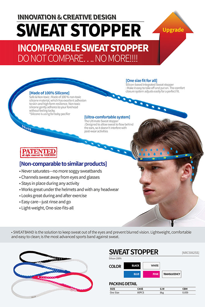 innovative & Creative design[SWEAT STOPPER]It disperses the sweat flowing on the forehead fot the side preventing from inflowing into the eyes to make you feel comfortable. Works great under the helmets and with any headwears.Easy care - just rinse and go * Safe & Non-toxic : Made of 100% Silicone - Excellent adhesion to skin and high form resilience. Non-toxic sillicone gently adheres to your forehead without feeling tacky. * One size fit for all - Make it easy to take off and put on. The comport closure system adjusts easily for a perfect fiT.Focus on running, bicycling, exercising or just working! Sweat away from eyes and glasses!!HOW TO USEPlease adjust the left and right band rings to match size of your head and wear it in combination with the band holes in each step