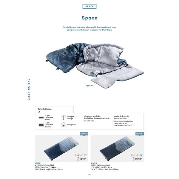 The Deuter Space II sleeping bag is one of the family members look more elegant, although they are still the perfect companion for a camping holiday. The three versions are perfect for keeping warm overnight or having a nap on the meadow. Continuous zips allow you to easily transform them from a sleeping bag to a blanket. The pillow can be mounted or disassembled (to wash) using a zip. Comfort is ensured thanks to the padding material, the soft inner lining and the comfortable outer lining material in the arm area, while the strength of the outer lining material in the foot area ensures longevity. Space I is suitable for temperate climates, while Space II can withstand lower temperatures. The Space XL is longer and wider. The storage bag can be used for other purposes when it does not contain the bag. Features: Internal pocket for valuables Compression bag with Space I and II, multi-purpose bag with Space XL Thermal band insulated in the zip two way different laces. Filling: High-Loft Hollowfibre; Inner lining: Deuter Soft Micro; Outer lining: 210T Soft-Poly Taffeta / Dura Lite RS DEUTER Sleeping Bag System Deuter cut 3D-comfort sets the perfect balance between freedom of movement in the upper area and good insulation in the lower area. 1. Functional hood with pillow pocket offers an anatomical and comfortable fit. Drawcord channel with a soft padded with two different laces. 2. Insulated thermal strip throughout the zip to prevent heat escaping. 3. Double course zip allows two left and right zip sacks. Anti-snagging zipper tape. 4. Ergo Foot creates freedom of movement for the feet. The ergonomic cut ensures equal distribution of the pen and thus keeps the influence.